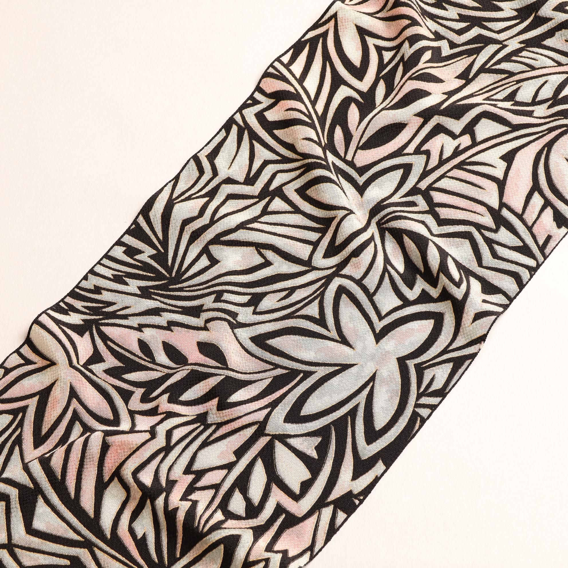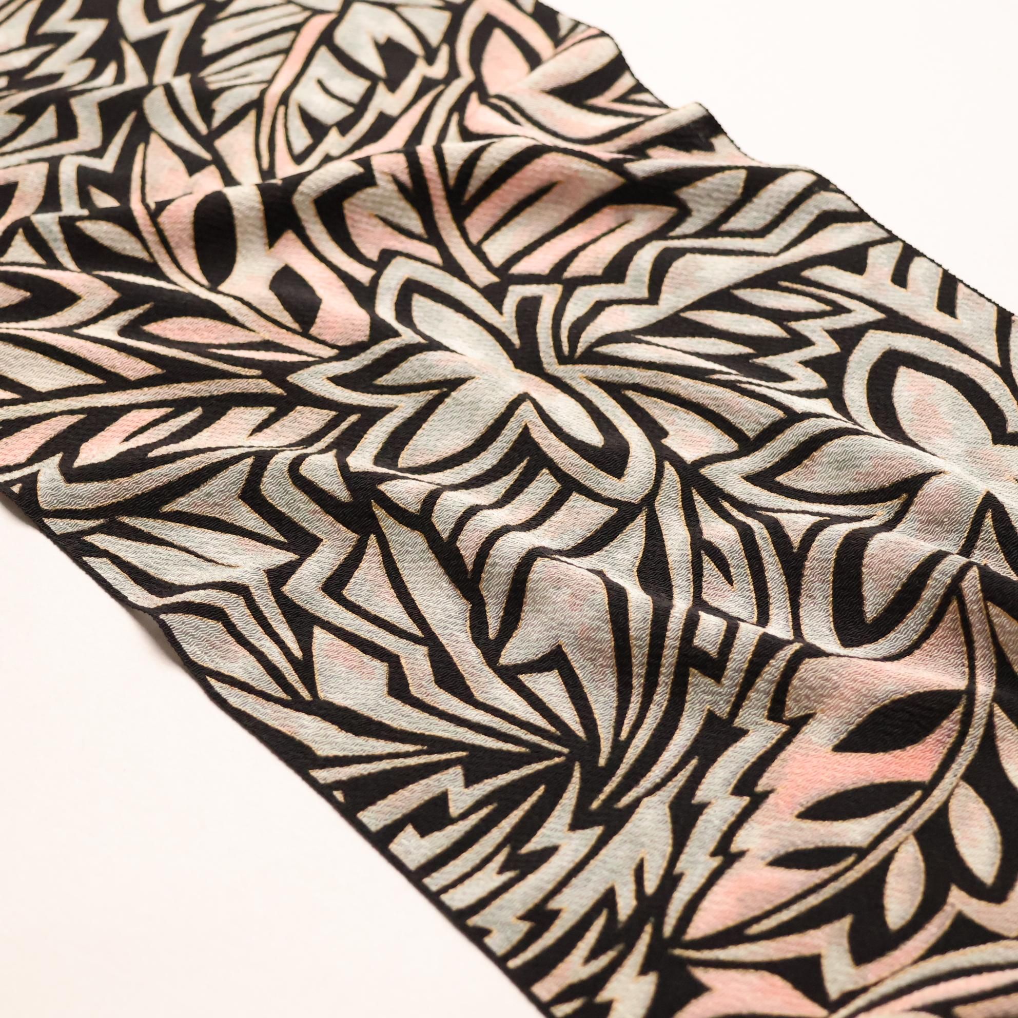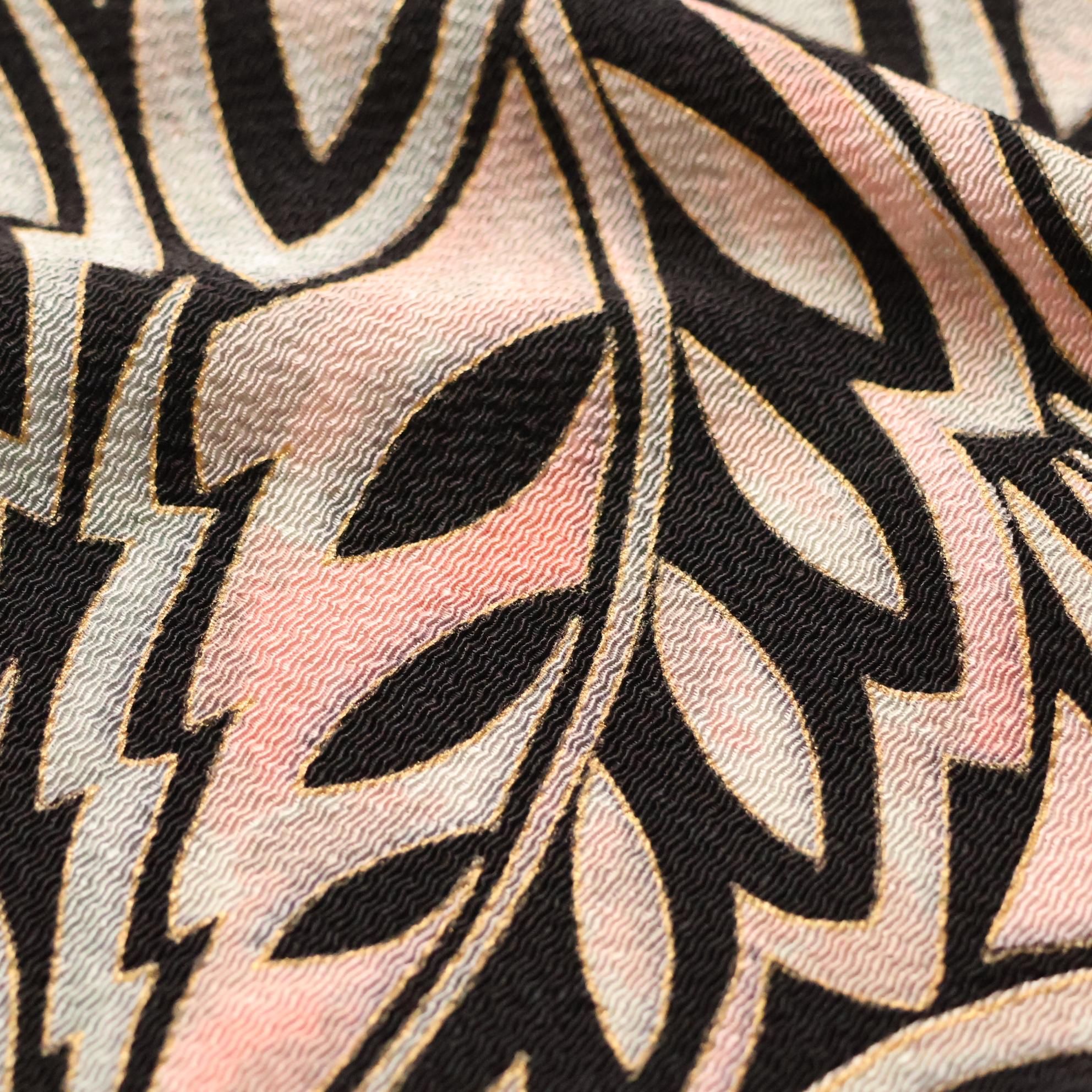 大きな葉がリズミカルに並ぶこちらの柄は、個性的で大胆なデザインながら、どこか上品で涼しげな印象を与えます。葉の一つひとつが大胆に描かれ、まるで風に揺れる葉陰のような軽やかさを演出。特に、紬やカジュアルな洒落着に合わせることで、全体に程よいアクセントが加わり、和装に新しい表情をもたらします。