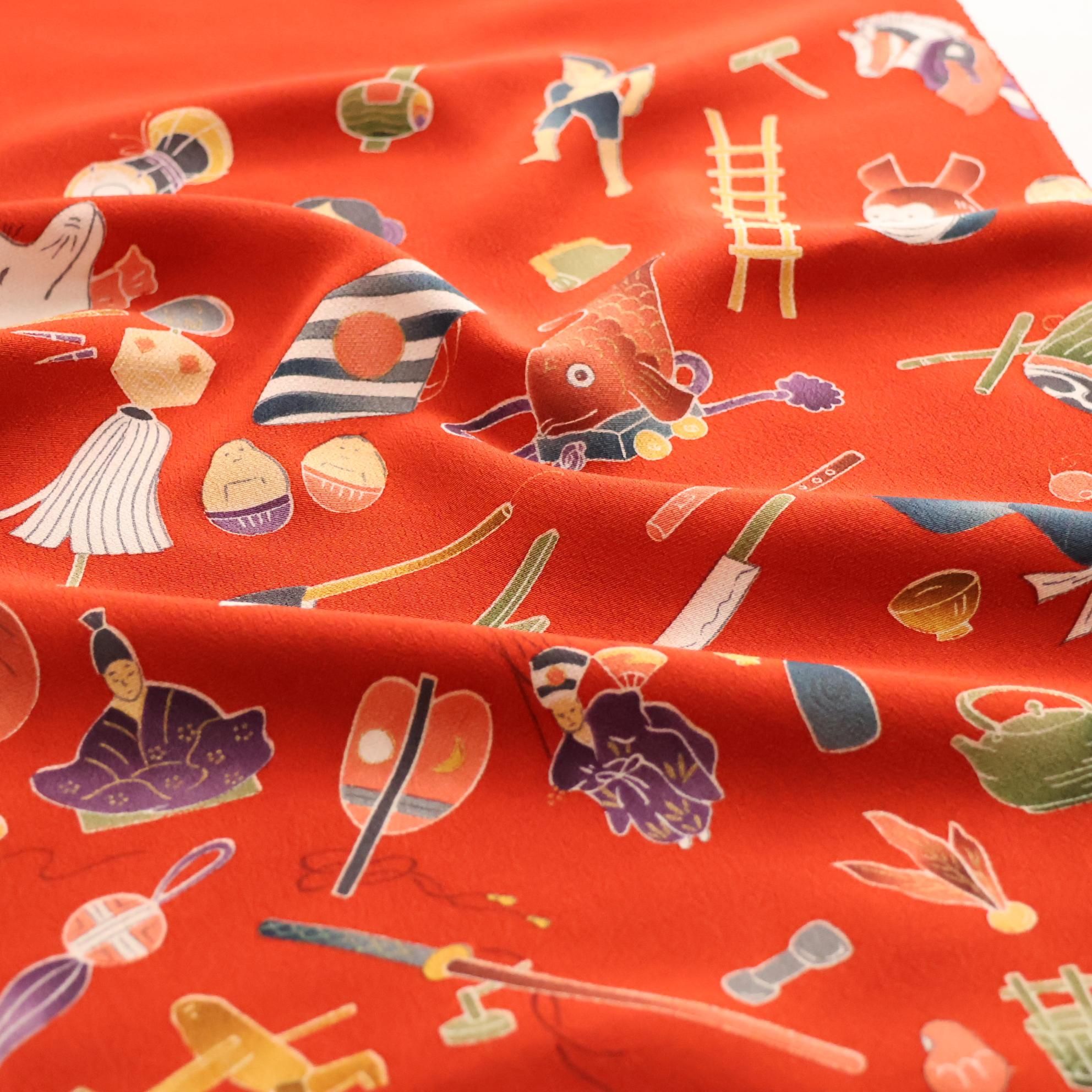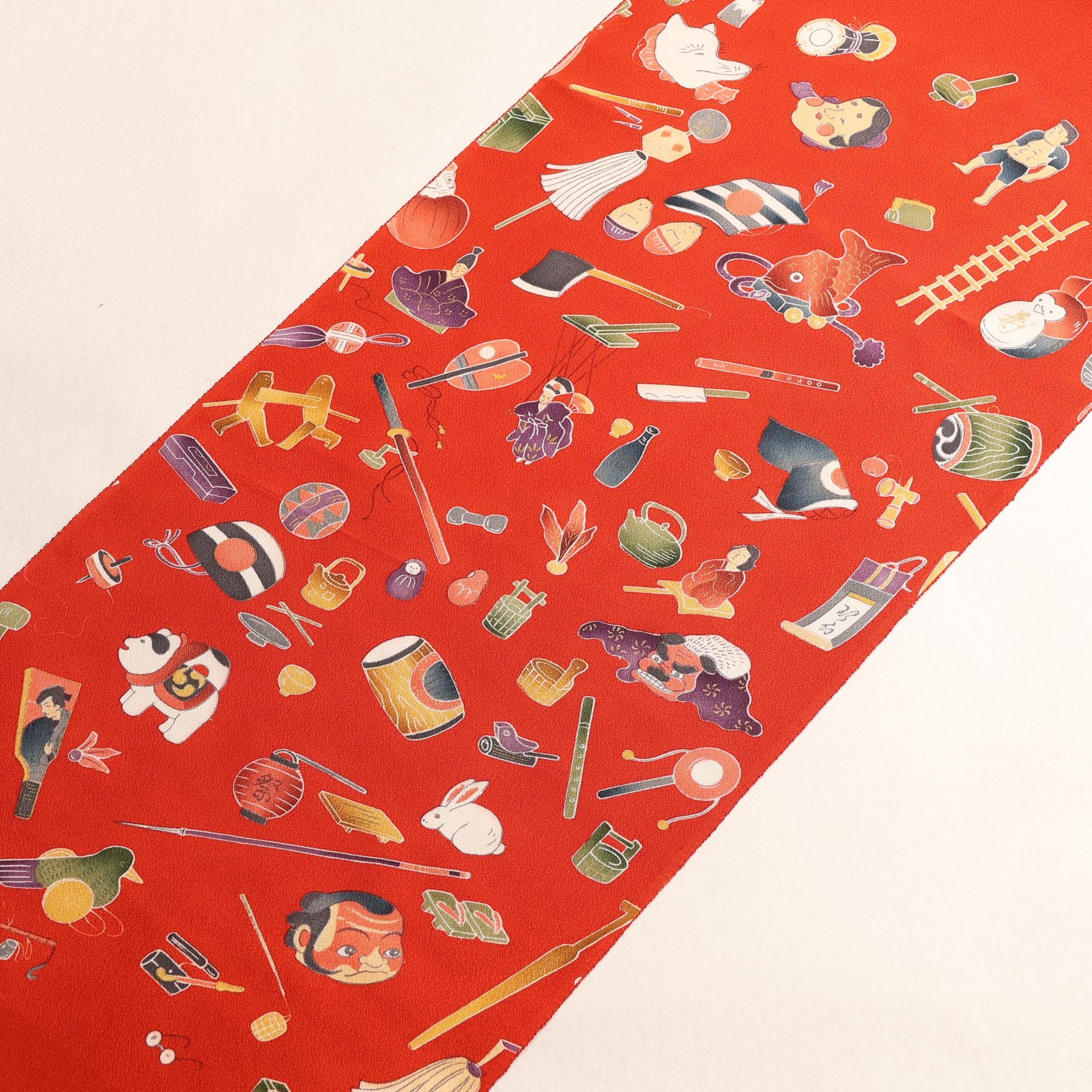 おもちゃをモチーフにした愛らしい帯揚げです。小さな動物の人形やこま、だるまなど、どこか懐かしさを感じさせる可愛いおもちゃが所々に顔を覗かせています。帯の隙間からチラリと見えるおもちゃ柄が、和装に遊び心とユーモアを添えてくれる一枚です。伝統的な装いの中に、ほのかな親しみやすさをプラスして、季節を問わず楽しめるデザインとなっています。