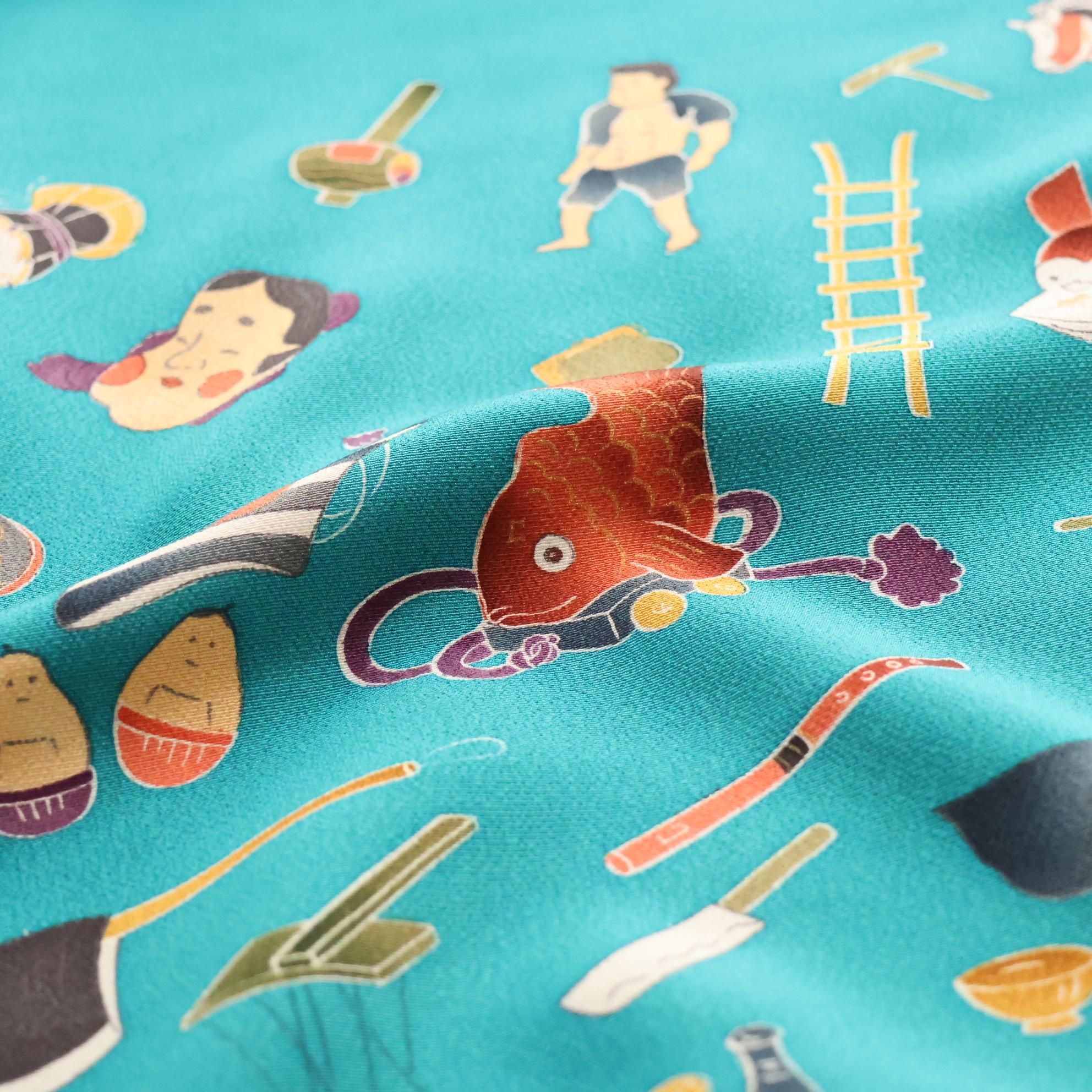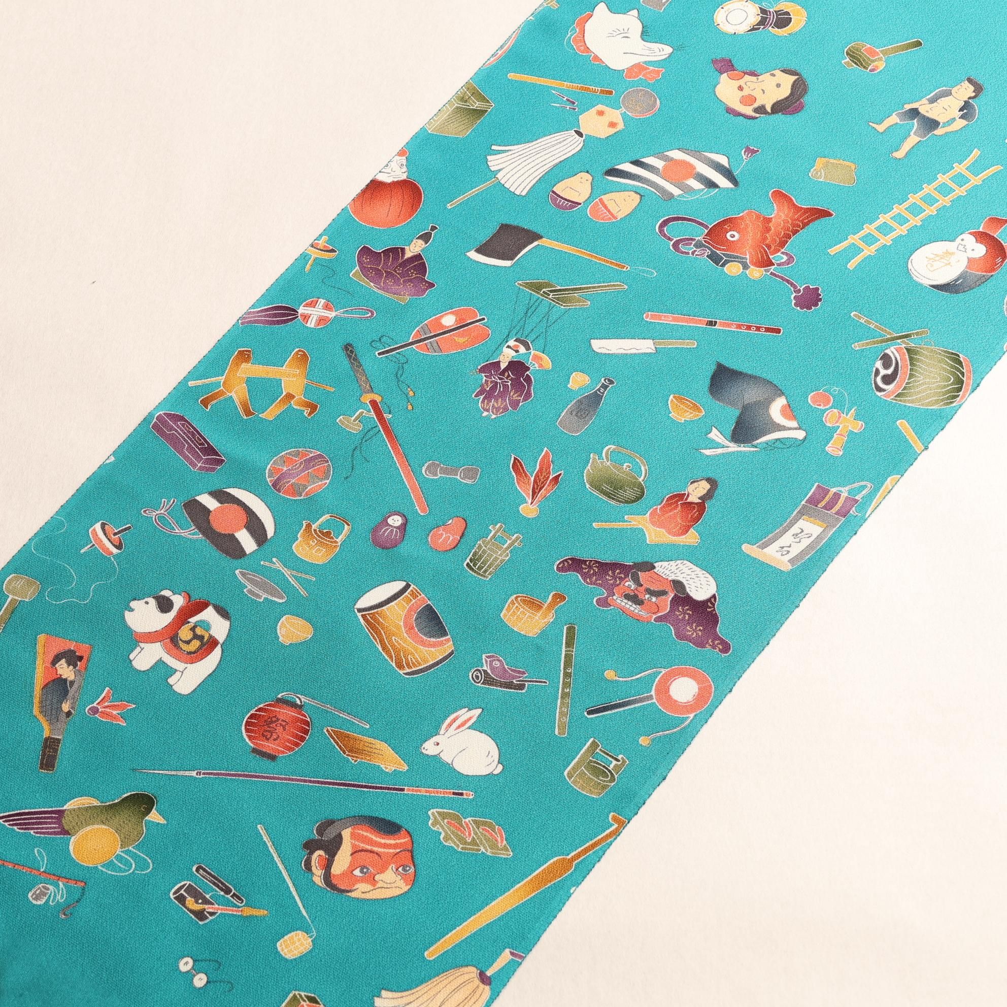 おもちゃをモチーフにした愛らしい帯揚げです。小さな動物の人形やこま、だるまなど、どこか懐かしさを感じさせる可愛いおもちゃが所々に顔を覗かせています。帯の隙間からチラリと見えるおもちゃ柄が、和装に遊び心とユーモアを添えてくれる一枚です。伝統的な装いの中に、ほのかな親しみやすさをプラスして、季節を問わず楽しめるデザインとなっています。